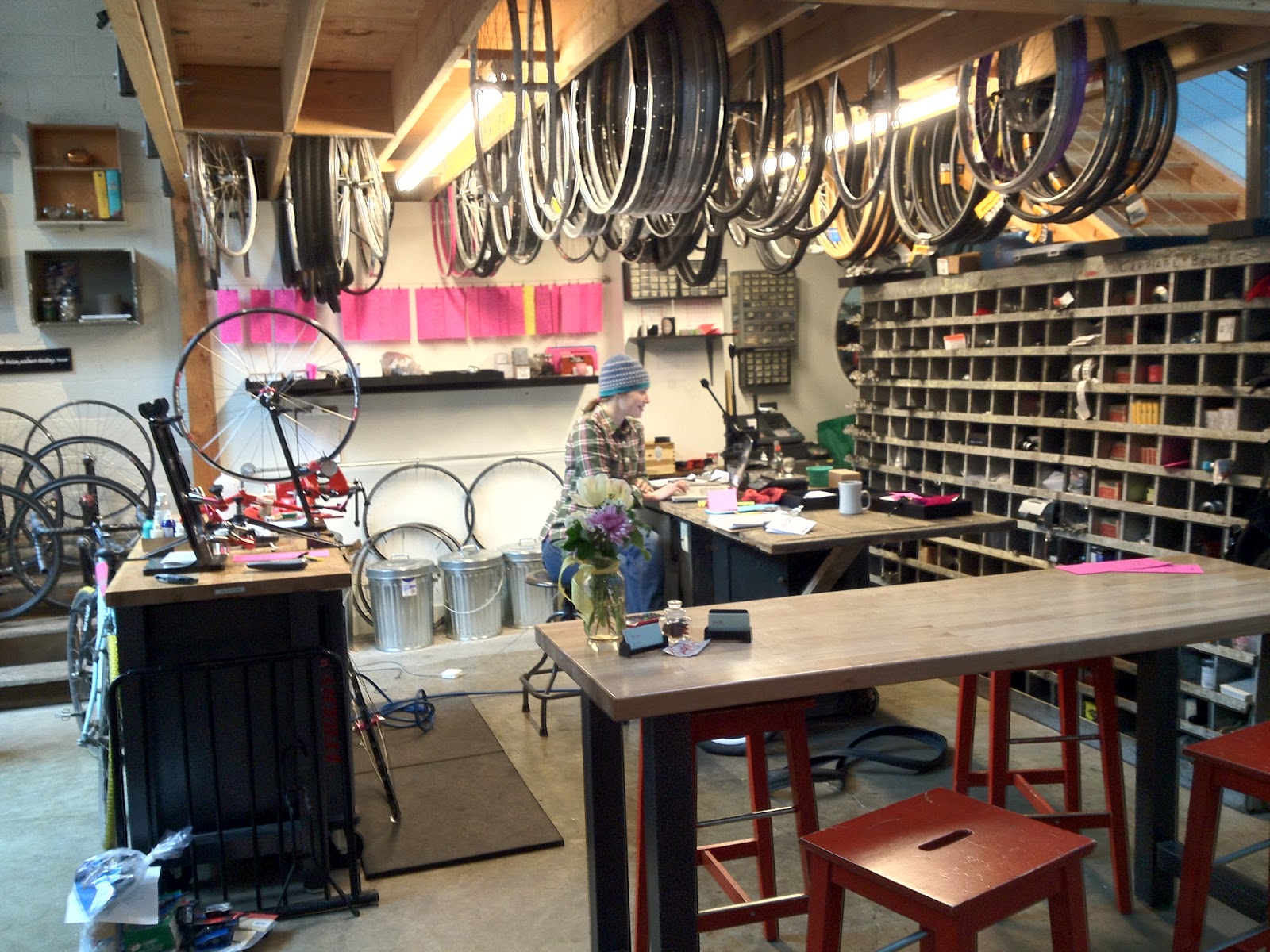 Also in the Hub Building, there are several other restaurants, Ink & Peat (where you can get "organic bedding" and "blooming branches", whatever those are, for your garden), and a fancy yoga studio.  But the high point was a little shop in the middle of the building that Chad, one of the other students, mentioned to me. Sugar Wheelworks!  A really cool looking bicycle wheel building shop founded and run by a woman.  I almost went in and ordered a pair on the spot ....  From the shop's website FAQ page, what are the main reasons to order handmade wheels?  They are sustainable, and soulful.  I could not agree more.