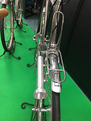 His bikes are a very different concept than Renovo. Solid wood (but surprisingly light -- I think a light type of wood). And not just the frame is wood (and no metal inserts like Renovo -- he is a purist). The saddle and seatpost, and the bars and fork, and even the wheel rims are wood. He even has some wheels with wooden four-spoke designs. He says his design is more durable than other wood bikes, and still comfortable. He said there is one customer who rides his Sano 1000 kms a month. (I told him that I have ridden my Renovo on 200, 400 and 600 km brevets.) But I suspect most of Sano wood bikes are on display somewhere. At 2 million yen and up, a bit out of my price range ... and I have my doubts about whether any of them are being ridden as hard as I ride my bikes.