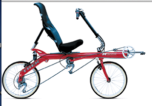 I once had a Trek R200 recumbent, purchased at a deep discount on a close-out sale when I lived in the U.S. It had a "double rear derailleur" drivetrain, a rear suspension, and small wheels. It was the only recumbent model Trek ever made, and it is the only Trek bike I ever bought. I gave the R200 to a friend when I moved to Japan -- the heavy, unwieldly frame was not something to add to our moving baggage, and I had no idea where I would store it in Tokyo. Besides, it was SLOW climbing hills. I could almost feel the blood rushing to my head as I desperately, slowly, spun up the road near our house with my toes pointed into the air.