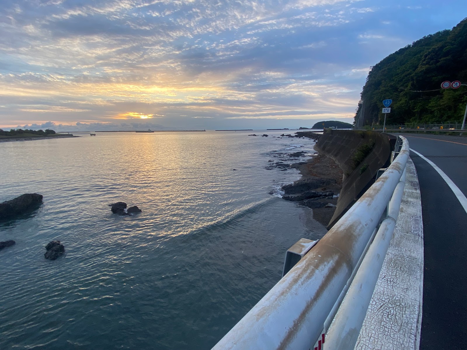 I made acceptable time heading for Kushimoto at the southern tip of the peninsula. We were protected from the wind by mountains to our west in many places. A couple places where it was more exposed, and we headed west ... in Shingu to get to a bridge crossing a river ... the wind slowed me to a crawl. Some of the sea coast was very pretty, as the sun rose. The mountains also looked densely forested and a bit mysterious.