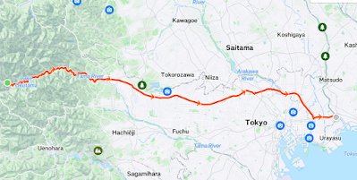 Or even go through Saitama (Tokorozawa ... Wako) and a longer stretch of the Arakawa to avoid traffic lights and take a very fast, dark Arakawa path 105.81kms?